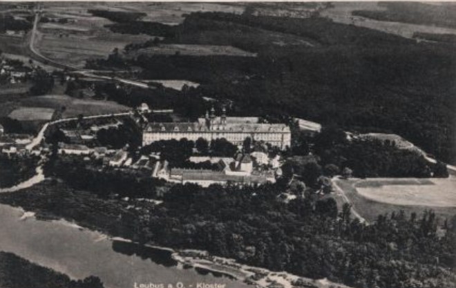Photo left: Departure of families resettled in Silesia. Centre de Documentation et de la recherche sur la Résistance. Photo right: Aerial view of Leubus labour camp 1942. Wikipedia